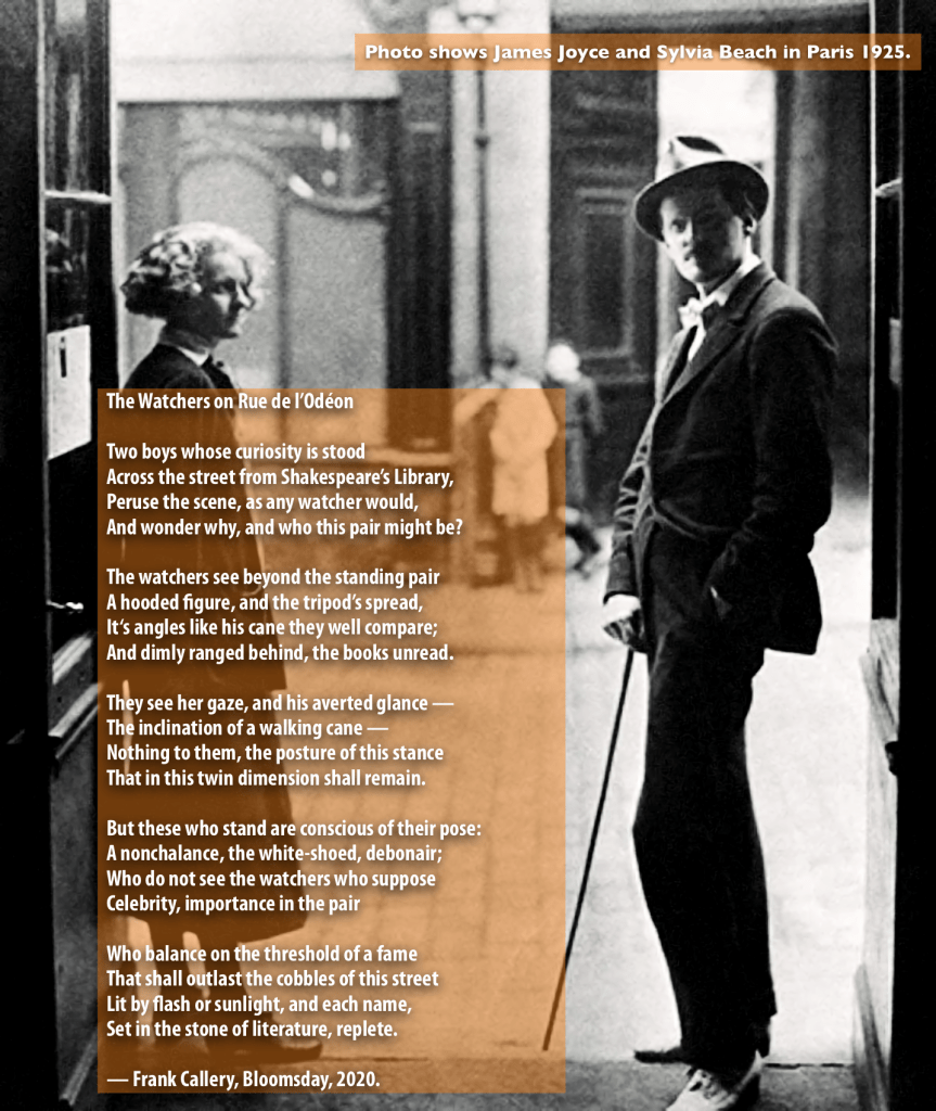 The Boy at the Window I was the watcher; I saw the man - He smiled as he turned with his tripod in hand. I saw the boys who stood over the street, As they looked at the man with white shoes on his feet; And the woman we saw every day in the store, With the treasure of books, from ceiling to floor. But the man with the specs and the walking cane, I saw him then, but never again. And then in ‘Le Temps’, the picture appeared And mother said, “Look, you’re famous, my dear!” We took ‘Le Temps’, the paper of choice, And we learned of the Irishman, Monsieur James Joyce - And his name on the books, in the window, brand new - The text, it was white on a cover of blue. We saw Madam Beach, as we passed each day, On occasions she smiled, but had nothing to say. - © Frank Callery.