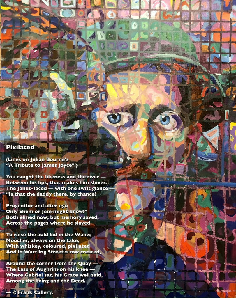 Rejoyce — Dublin (1982) Rejoycemen acity is noun-named A suffix of fastened slums His once woocall reached. Lore-learned came he with loselfriends Loping through laden latitudes* All northern, naughtywit. Softbeck blowkiss of maid Furgate-vard-farthingale Sweep of furbelow. Mollmott-juste-wombwarm* Eager where under eiderdown all Upheaval fell to flow, floor, softhush. Daybright brought eye dimrim Glare of focusblur All shopfront knowledge Tang and taste of Peapod, picklepot, rindhair Plumbruse, port, pigscheek Porterpaddypiss. Past. Nowday, all Fall to brickcrush Gone, grandeur all fallow Fetch of turnstone Irislife rainbowcrock. ii. Ahh! What comes to Bloom May, once flower; weary now. Endall, no grace nor late call recant. Reborn, tide swept, in the gyp of gender. UpfromDown — face down in wallow Found-near-shore new father, Nightwalker-cabman-horsepiss — stale ullage of the wine-dark sea. Dropdown, nickersniff The scent of soliloquy Bellpeal in the Bb — George’s Joined-at-the-hip, Yes! È © Frank Callery.